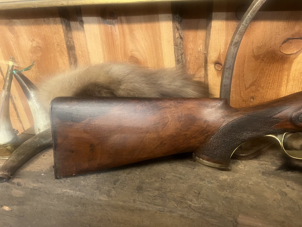 Ett mycket ovanligt slaglåsgevär, då hagelgevär med slaglås brukar vara sida/sida.