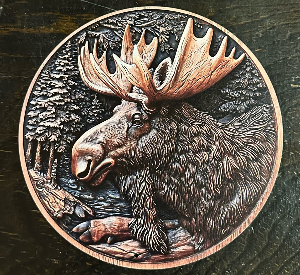 Mycket vacker plåtskylt på en stor älg.